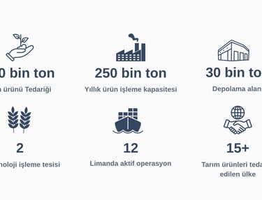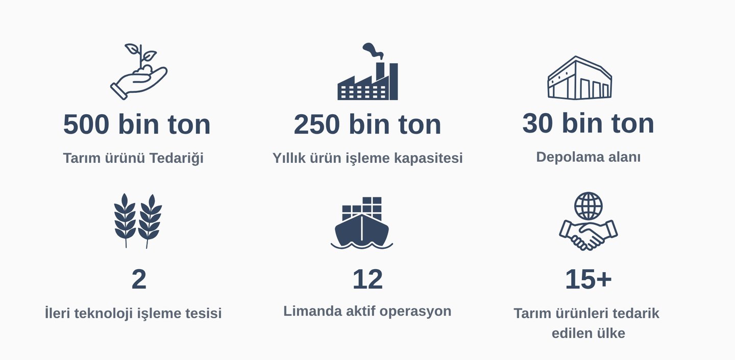 Her yıl 500 bin tonu aşan yağlı tohumlar, tahıllar ve çeşitli tarım ürünlerinin tedarik, işleme ve ticaret süreçlerini yönetiyoruz. Sahadan başlayan değer zincirimizi; üretim, depolama, işleme, lojistik ve uluslararası dağıtım adımlarıyla küresel ölçekte sürdürüyor, kesintisiz tedarik güvencesi sunuyoruz.Tarımın ham maddesinden nihai ürüne kadar tüm aşamalarında aktif rol alarak, gıda güvenliğini destekleyen, sürdürülebilir ve yüksek kaliteli çözümler üretiyoruz.